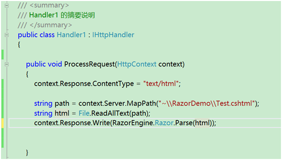 1 /// <summary> 2 /// 自己封裝一個Razor.Parse()方法 3 /// </summary> 4 /// <param name="context">上下文對象</param> 5 /// <param name="cshtmlPath">.cshtml文件的相對路徑</param> 6 /// <param name="obj">要傳入的對象參數</param> 7 /// <returns>返回一個解析過的Razor模板字符串</returns> 8 private string RazorParse(HttpContext context, string cshtmlPath,params object[] obj) 9 { 10 //獲得.cshtml文件的絕對路徑 11 string path = context.Server.MapPath(cshtmlPath); 12 //通過路徑將文件讀成文本 13 string txt = File.ReadAllText(path); 14 15 //為模板準備一個緩沖,根據文件的修改時間動態組合 16 string cacheName = path + File.GetLastWriteTime(path); 17 18 //根據需求是否要傳入對象參數,在調用Razor.Parse方法返回解析好的Razor模板 19 return obj.Length > 0 ? RazorEngine.Razor.Parse(txt, obj[0], cacheName) : RazorEngine.Razor.Parse(txt, cacheName); 20 21 }