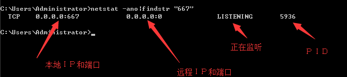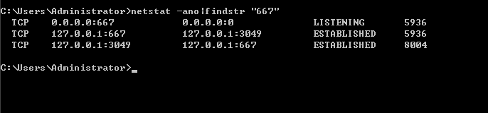看下面的圖,監聽668端口,此時并沒有客戶端連接到它,所以還處在監聽狀態,PID可以在任務管理器中找到,或者使用tasklist | findstr "5936" 找到對應的進程