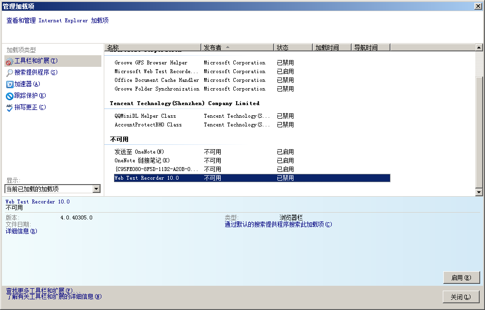 工具->管理加載項->工具欄和擴展->不可用->web test recorder改為啟動即可