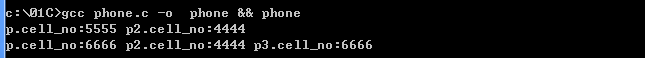 1 #include <stdio.h> 2 3 typedef struct { 4 int cell_no; 5 const char *wallpapaer; 6 } phone; 7 8 int main(){ 9 phone p={5555,"sinatra.png"}; 10 phone p2=p; 11 p2.cell_no=4444; 12 printf("p.cell_no:%i p2.cell_no:%i\n",p.cell_no,p2.cell_no); 13 phone* p3=&p;//將結構p的地址賦值給*p3 14 (*p3).cell_no=6666; 15 printf("p.cell_no:%i p2.cell_no:%i p3.cell_no:%i\n",p.cell_no,p2.cell_no,(*p3).cell_no); 16 return 0; 17 }
