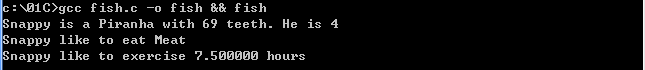 1 #include <stdio.h> 2 3 //定義數據結構 4 struct fish{ 5 const char *name; 6 const char *species; 7 int teeth; 8 int age; 9 }; 10 11 void catalog(struct fish f){ 12 printf("%s is a %s with %i teeth. He is %i\n",f.name,f.species,f.teeth,f.age);//訪問結構的字段 13 } 14 15 int main(){ 16 //聲明結構變量 17 struct fish snappy={"Snappy","Piranha",69,4}; 18 catalog(snappy); 19 return 0; 20 }