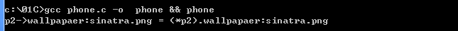 1 int main(){ 2 phone p={5555,"sinatra.png"}; 3 phone* p2=&p; 4 printf("p2->wallpapaer:%s = (*p2).wallpapaer:%s\n",p2->wallpapaer,(*p2).wallpapaer);// 5 return 0; 6 }